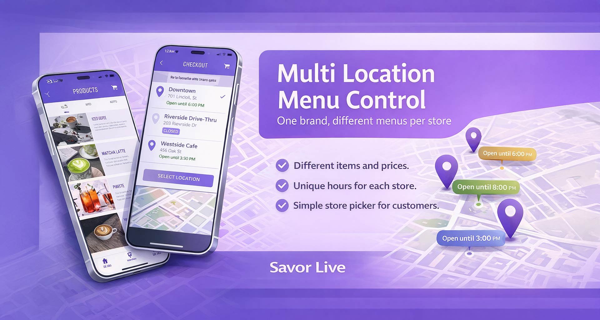 Growing shops need freedom to tune each store without losing the brand. With Savor Live you can run one app and one backend, then set items, prices, and hours per location. Customers pick their store in the app, see the right menu, and order with confidence. Your team keeps a single brand look while each shop runs the lineup that fits its neighborhood.